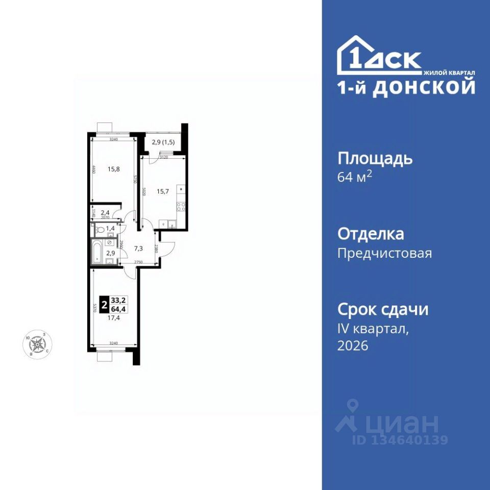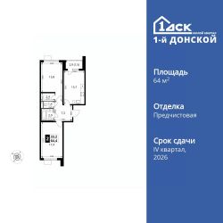 Продаётся 2-к квартира номер 627 общей площадью 64.4 кв.м. на 17-м этаже 24 этажного здания. Отделка Whitebox.