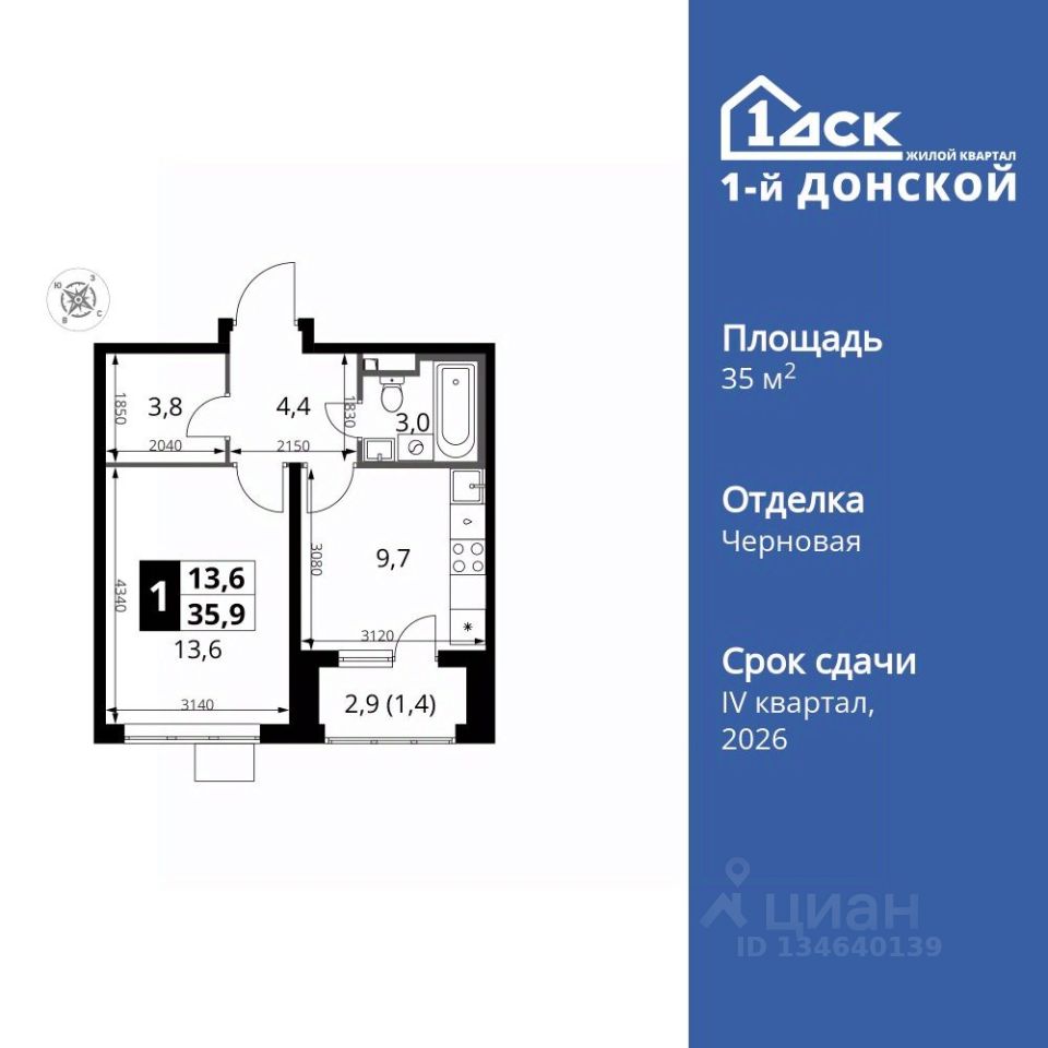 Продаётся 1-к квартира номер 689 общей площадью 35.9 кв.м. на 24-м этаже 24 этажного дома. Отделка Whitebox.