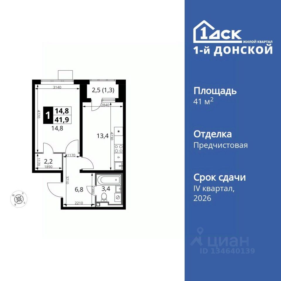 Продаётся 1-к квартира номер 898 общей площадью 41.9 кв.м. на 22-м этаже 24 этажного здания. Отделка Whitebox.