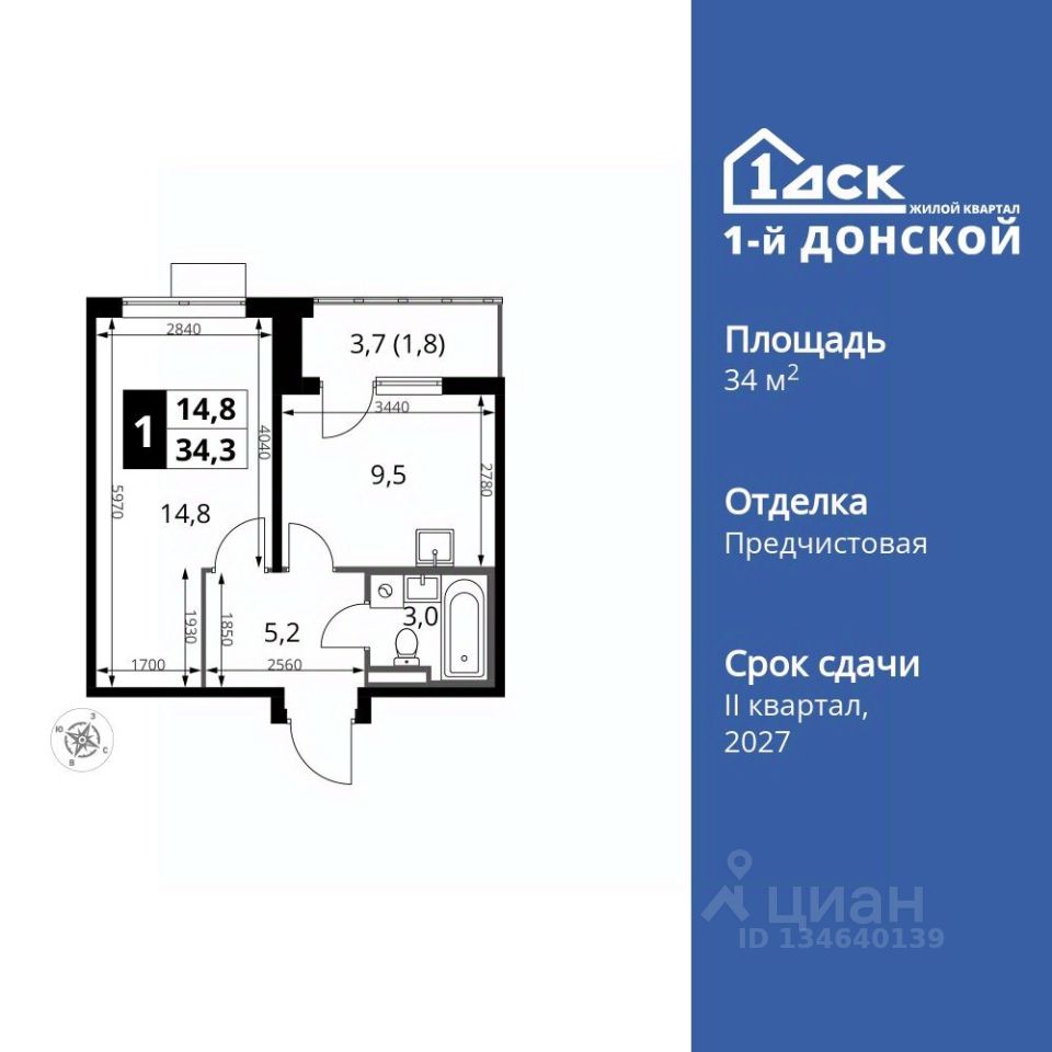 Продаётся 1-к квартира номер 107 общей площадью 34.3 кв.м. на 11-м этаже 24 этажного здания. Отделка Whitebox.