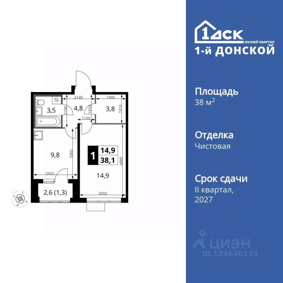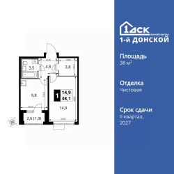 Продаётся 1-к квартира номер 483 общей площадью 38.1 кв.м. на 24-м этаже 24 этажного здания. Чистовая отделка.