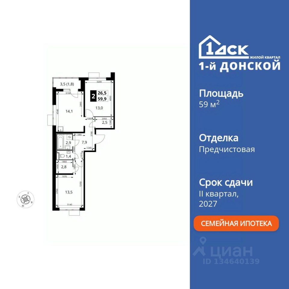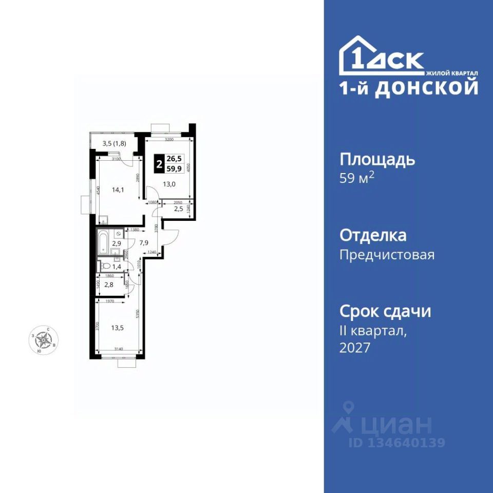 Продаётся 2-к квартира номер 425 общей площадью 59.9 кв.м. на 19-м этаже 24 этажного здания. Отделка Whitebox.