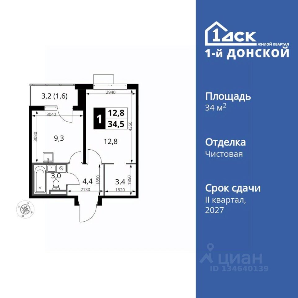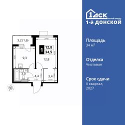 Продаётся 1-к квартира номер 369 общей площадью 34.5 кв.м. на 13-м этаже 24 этажного здания. Чистовая отделка.
