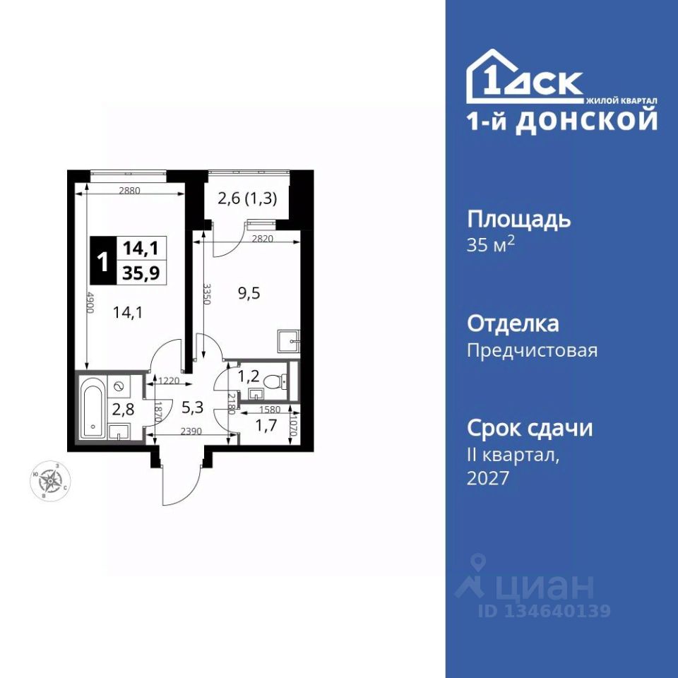 Продаётся 1-к квартира номер 494 общей площадью 35.9 кв.м. на 2-м этаже 24 этажного здания. Отделка Whitebox.