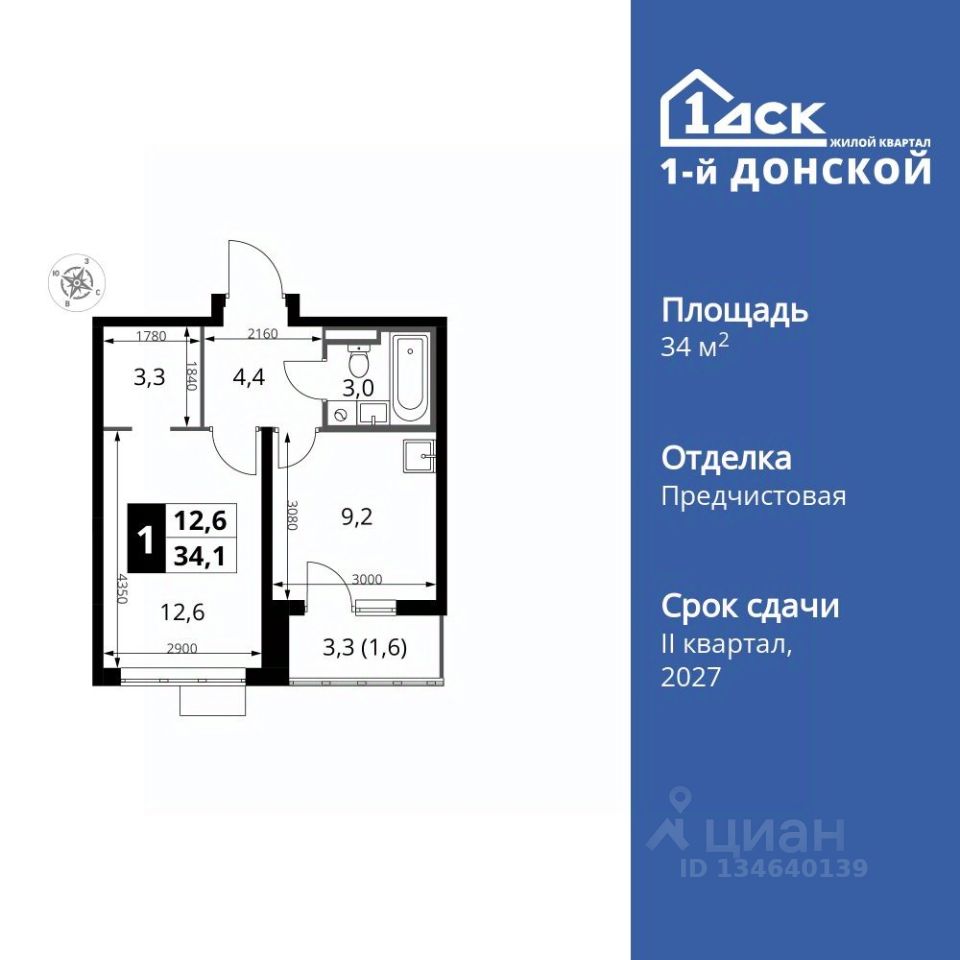 Продаётся 1-к квартира номер 546 общей площадью 34.1 кв.м. на 7-м этаже 24 этажного здания. Отделка Whitebox.