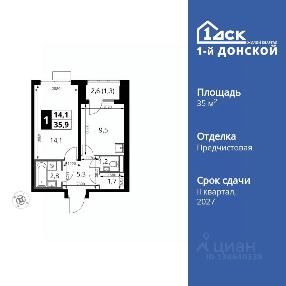 Продаётся 1-к квартира номер 571 общей площадью 35.9 кв.м. на 9-м этаже 24 этажного здания. Отделка Whitebox.