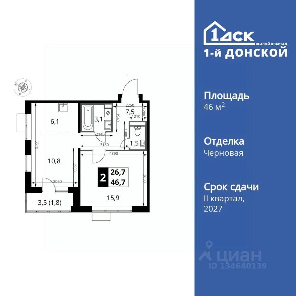Продаётся 2-к квартира номер 824 общей площадью 46.7 кв.м. на 11-м этаже 24 этажного дома. Отделка Whitebox.