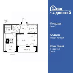 Продаётся 2-к квартира номер 877 общей площадью 50.2 кв.м. на 17-м этаже 24 этажного здания. Отделка Whitebox.