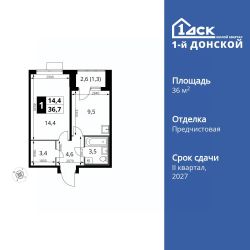 Продаётся 1-к квартира номер 871 общей площадью 36.7 кв.м. на 16-м этаже 24 этажного здания. Отделка Whitebox.