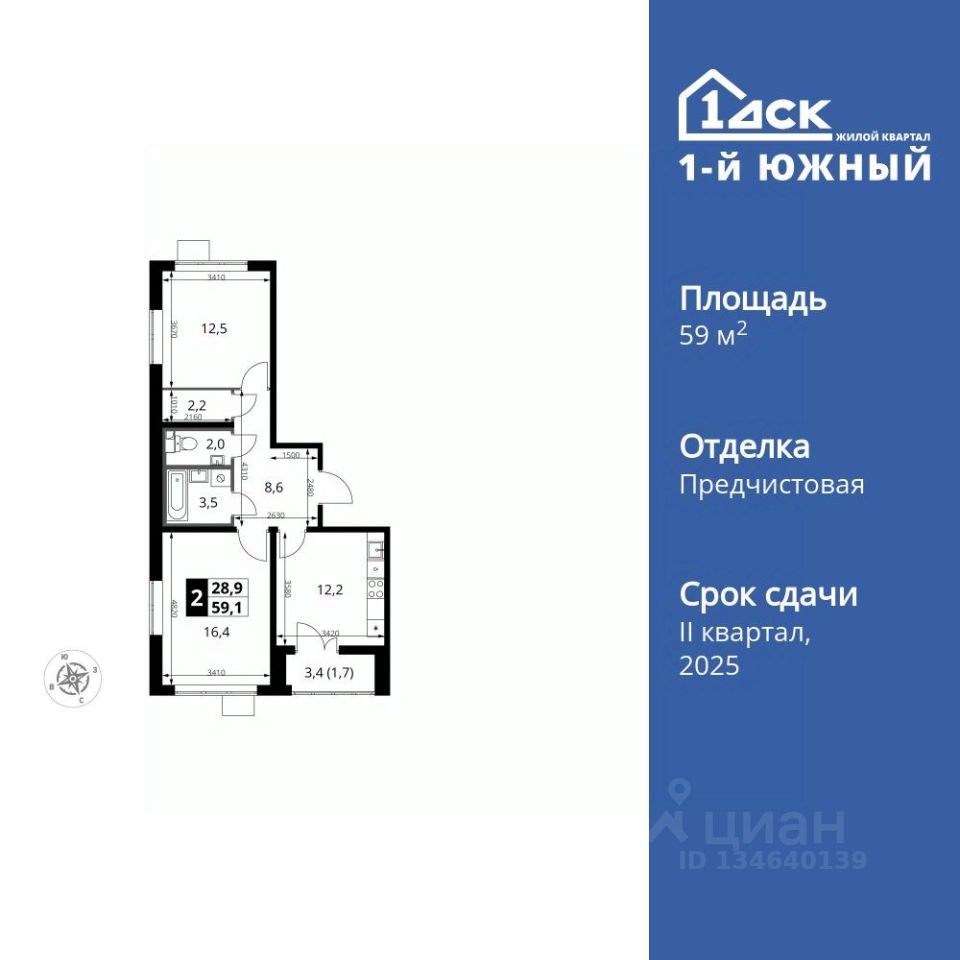 Продаётся 2-к квартира номер 89 общей площадью 59.1 кв.м. на 24-м этаже 24 этажного здания. Отделка Whitebox. Цена с учётом скидки.
