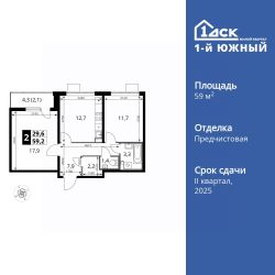 Продаётся 2-к квартира номер 216 общей площадью 59.1 кв.м. на 22-м этаже 24 этажного здания. Отделка Whitebox. Цена с учётом скидки.