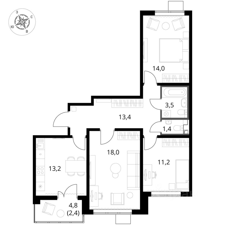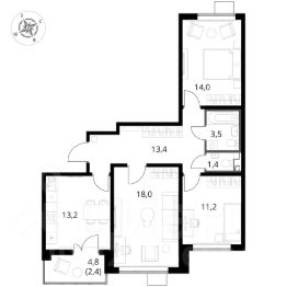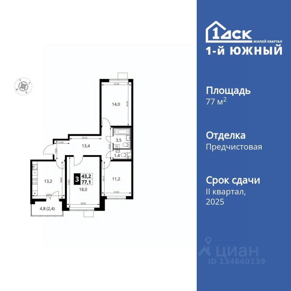 Продаётся 3-к квартира номер 97 общей площадью 77.1 кв.м. на 2-м этаже 24 этажного здания. Отделка Whitebox. Цена с учётом скидки.
