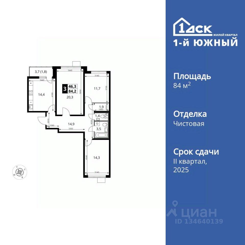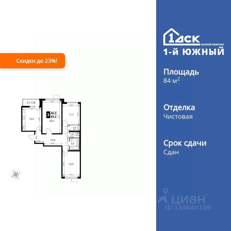 Продаётся 3-к квартира номер 419 общей площадью 84.2 кв.м. на 15-м этаже 25 этажного здания. Чистовая отделка. Цена с учётом скидки.