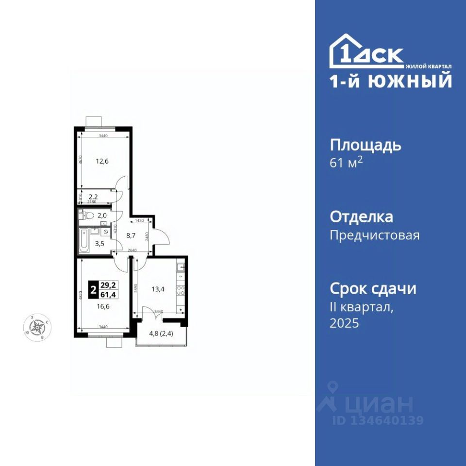 Продаётся 2-к квартира номер 591 общей площадью 61.4 кв.м. на 15-м этаже 25 этажного здания. Отделка Whitebox. Цена с учётом скидки.