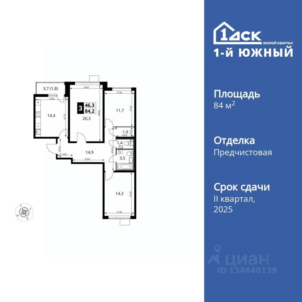 Продаётся 3-к квартира номер 594 общей площадью 84.2 кв.м. на 16-м этаже 25 этажного здания. Отделка Whitebox. Цена с учётом скидки.