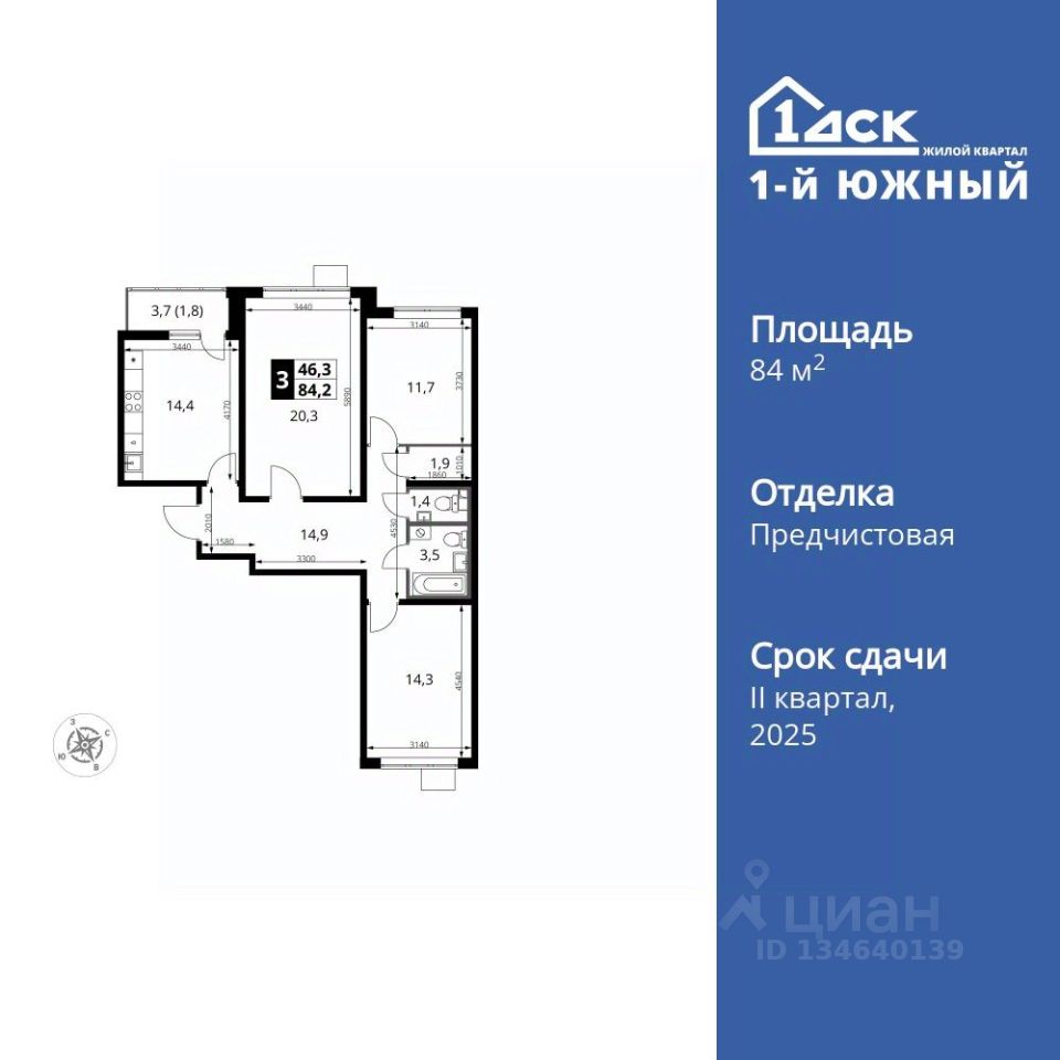 Продаётся 3-к квартира номер 643 общей площадью 84.2 кв.м. на 23-м этаже 25 этажного здания. Отделка Whitebox. Цена с учётом скидки.