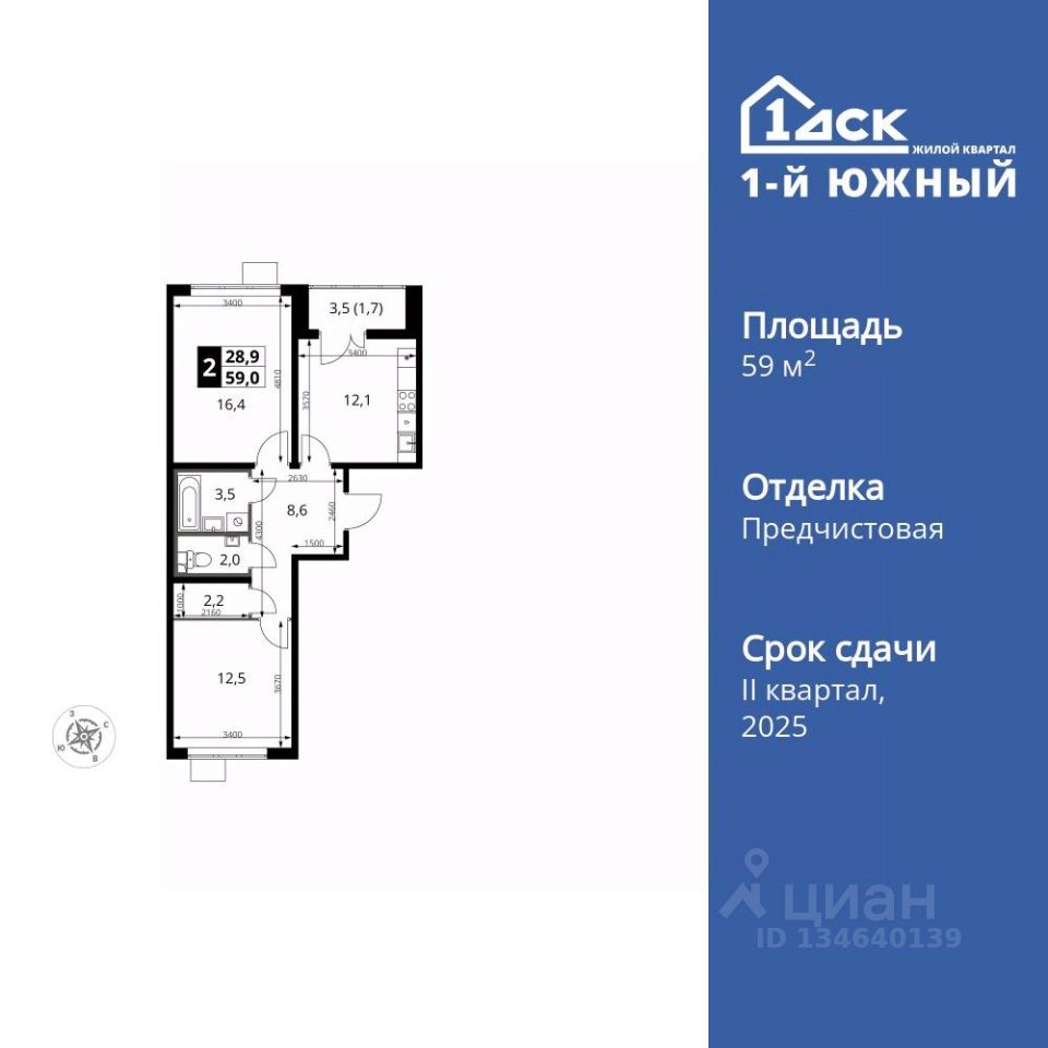 Продаётся 2-к квартира номер 694 общей площадью 59 кв.м. на 9-м этаже 25 этажного здания. Отделка Whitebox. Цена с учётом скидки.