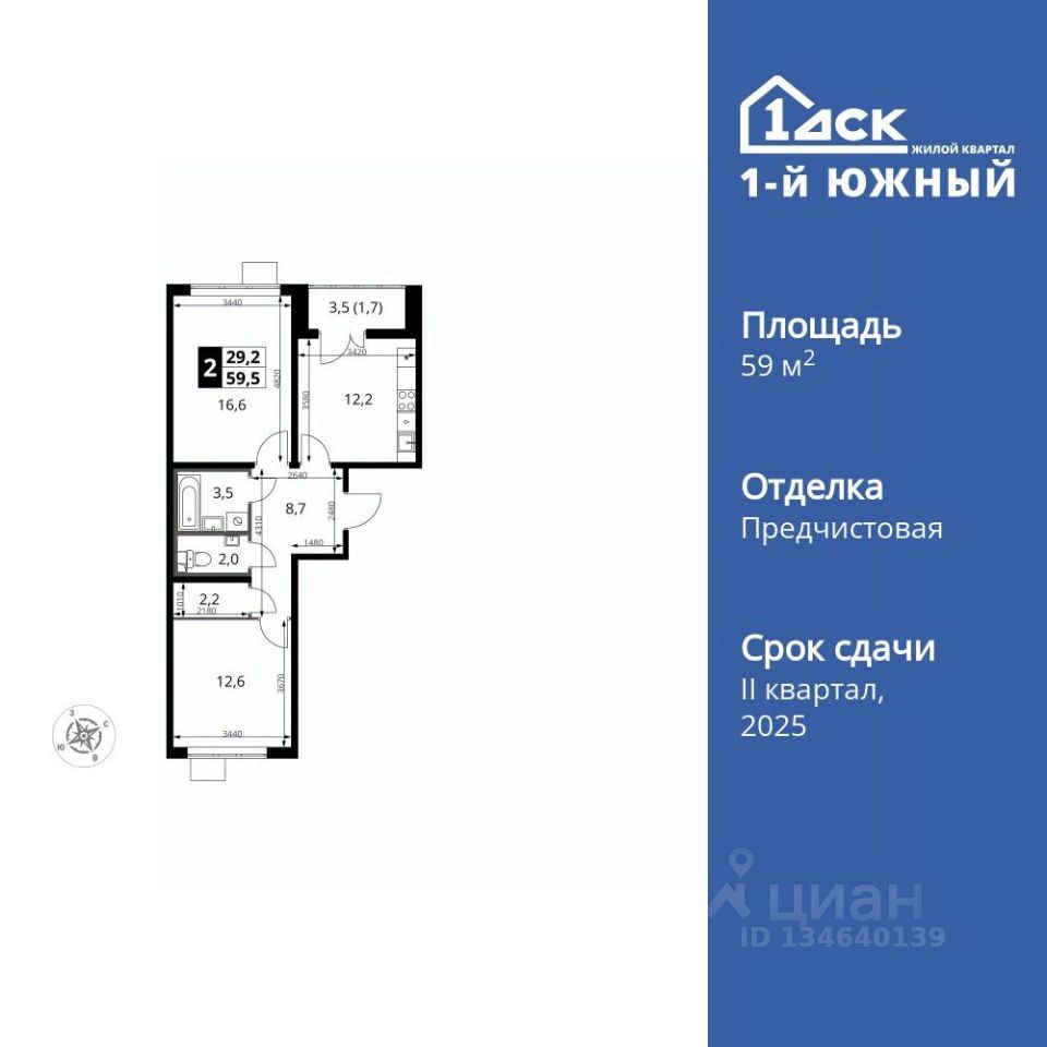 Продаётся 2-к квартира номер 734 общей площадью 59.5 кв.м. на 19-м этаже 25 этажного здания. Отделка Whitebox. Цена с учётом скидки.