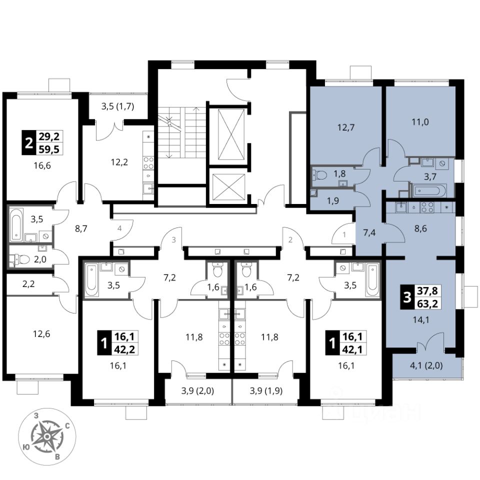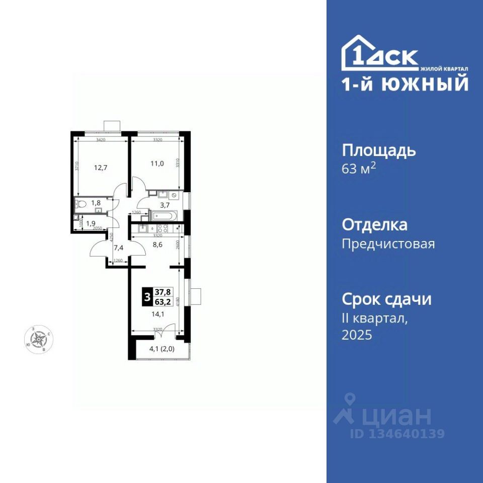 Продаётся 3-к квартира номер 751 общей площадью 63.1 кв.м. на 24-м этаже 25 этажного здания. Отделка Whitebox. Цена с учётом скидки.