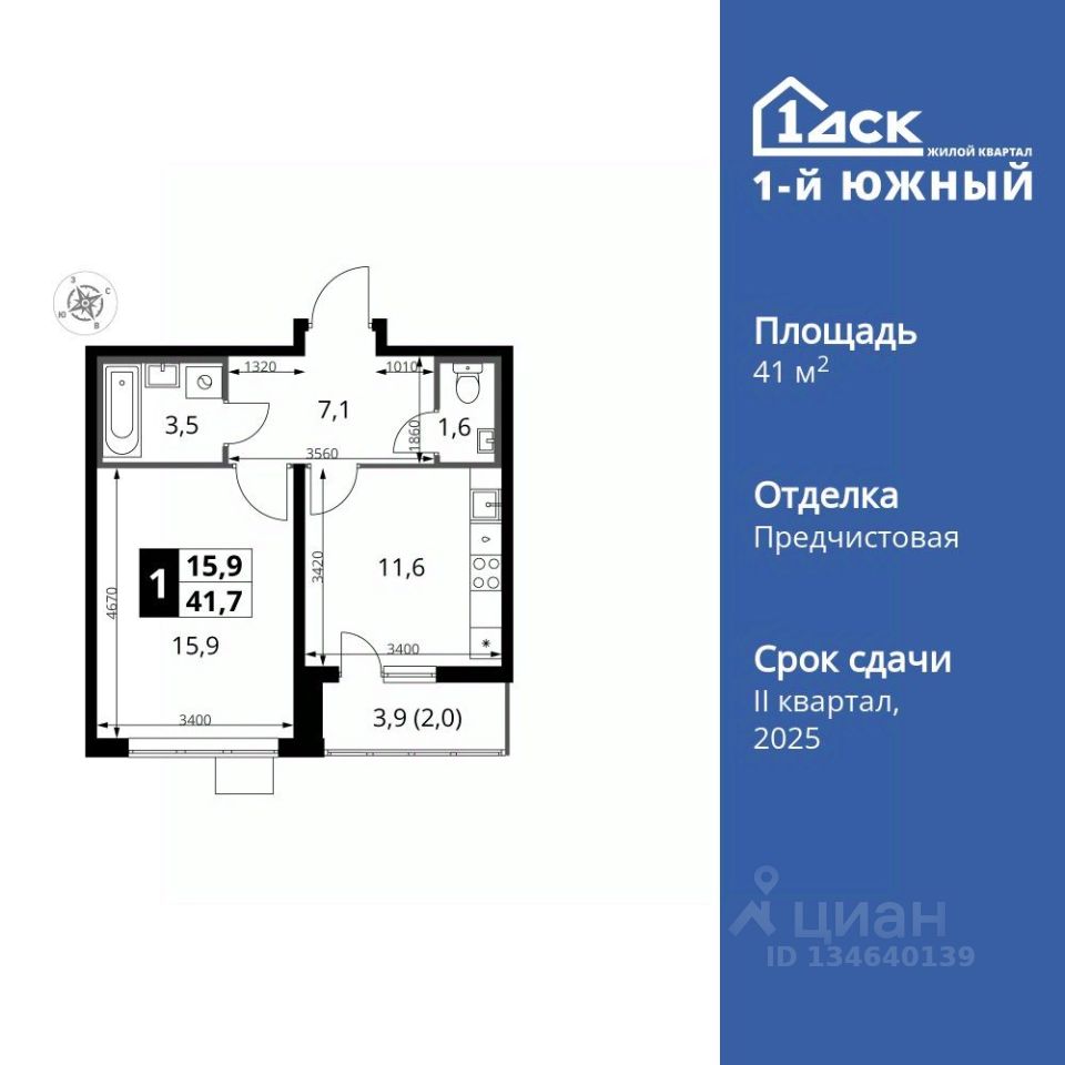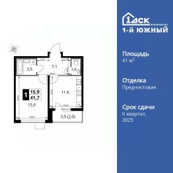 Продаётся 1-к квартира номер 681 общей площадью 41.6 кв.м. на 6-м этаже 25 этажного здания. Отделка Whitebox. Цена с учётом скидки.