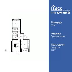 Продаётся 2-к квартира номер 21 общей площадью 59.1 кв.м. на 7-м этаже 24 этажного здания. Отделка Whitebox.