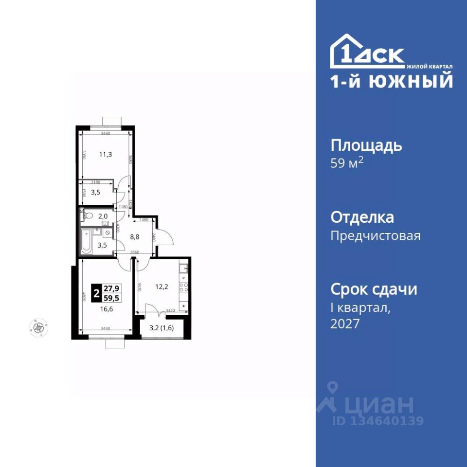Продаётся 2-к квартира номер 57 общей площадью 59.5 кв.м. на 16-м этаже 24 этажного здания. Отделка Whitebox.