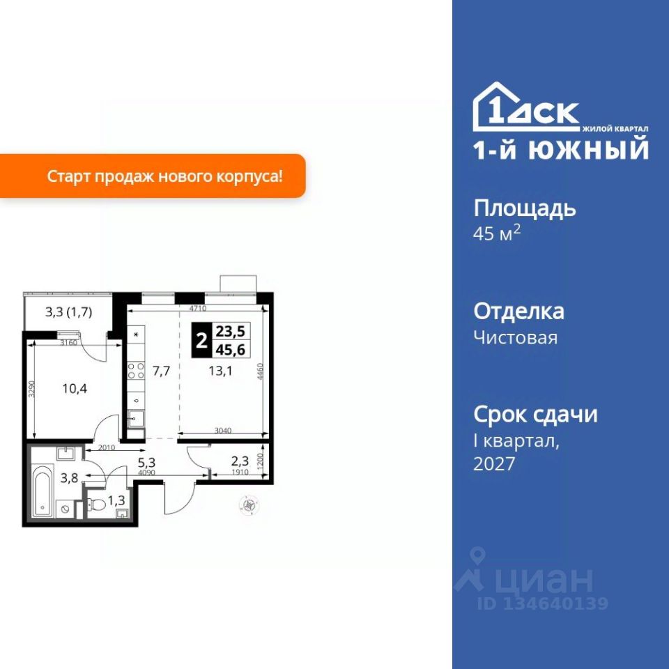 Продаётся 2-к квартира номер 202 общей площадью 45.6 кв.м. на 15-м этаже 24 этажного здания. Чистовая отделка.