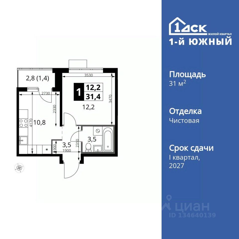 Продаётся 1-к квартира номер 220 общей площадью 31.4 кв.м. на 17-м этаже 24 этажного здания. Чистовая отделка.