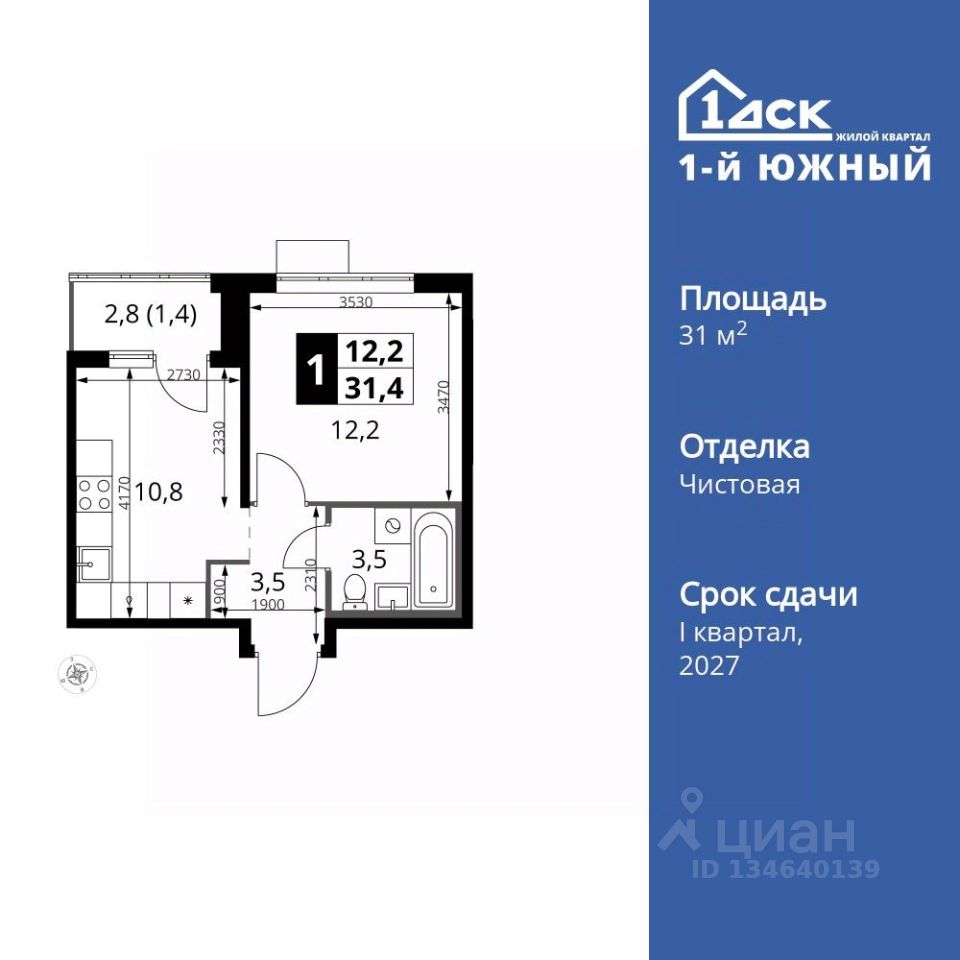 Продаётся 1-к квартира номер 172 общей площадью 31.4 кв.м. на 11-м этаже 24 этажного здания. Чистовая отделка.