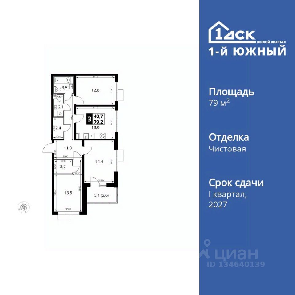 Продаётся 3-к квартира номер 157 общей площадью 79.2 кв.м. на 10-м этаже 24 этажного здания. Чистовая отделка.