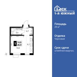 Продаётся 1-к квартира номер 456 общей площадью 28.9 кв.м. на 6-м этаже 24 этажного дома. Отделка Whitebox.