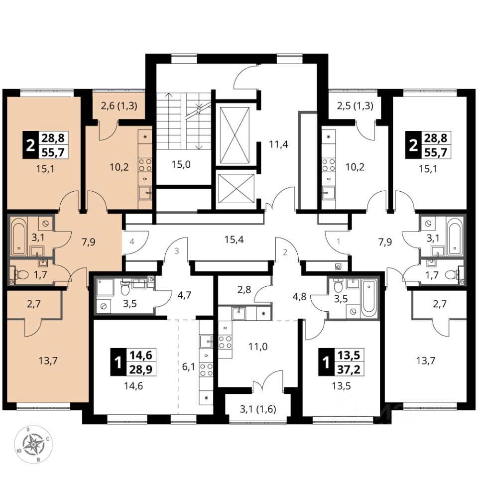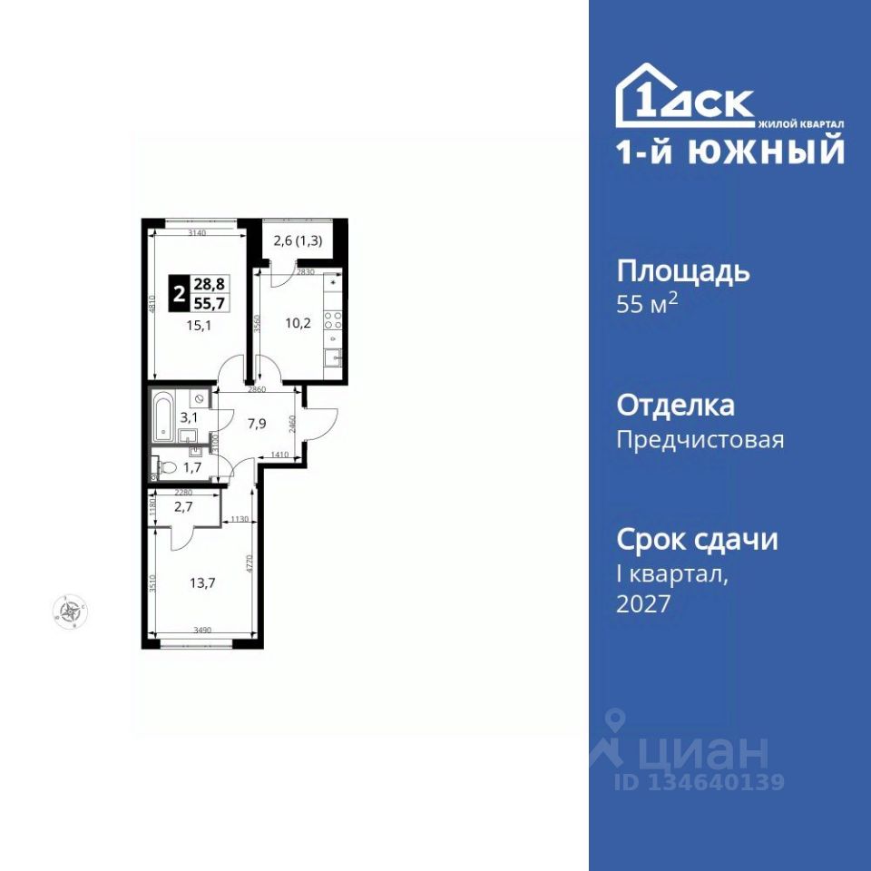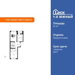 Продаётся 2-к квартира номер 441 общей площадью 55.7 кв.м. на 2-м этаже 24 этажного здания. Отделка Whitebox.