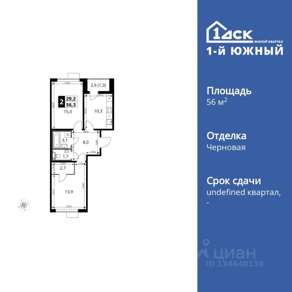 Продаётся 2-к квартира номер 485 общей площадью 56.3 кв.м. на 13-м этаже 24 этажного дома. Отделка Whitebox.