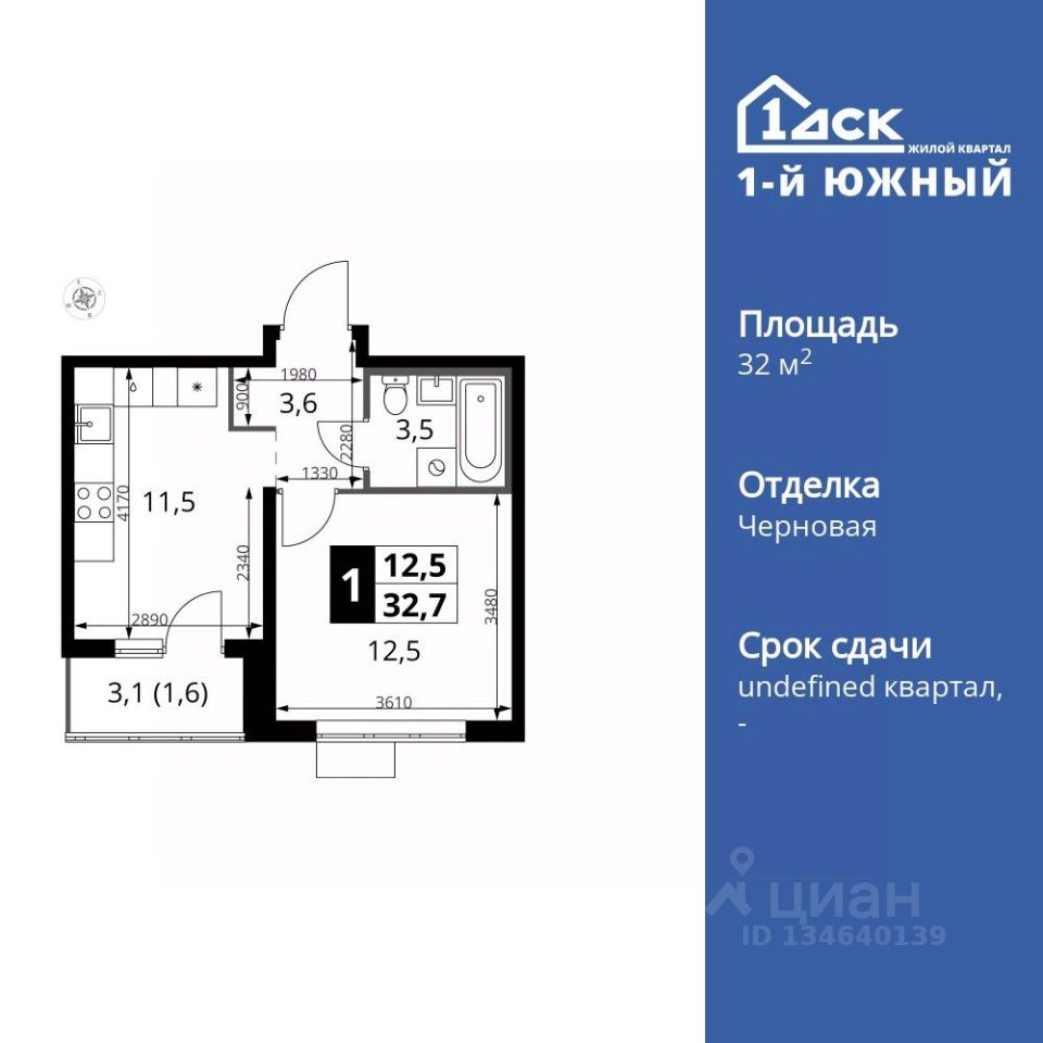 Продаётся 1-к квартира номер 583 общей площадью 32.7 кв.м. на 9-м этаже 24 этажного дома. Отделка Whitebox.