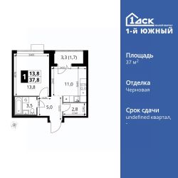 Продаётся 1-к квартира номер 585 общей площадью 37.8 кв.м. на 9-м этаже 24 этажного дома. Отделка Whitebox.