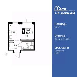 Продаётся квартира-студия номер 621 общей площадью 26.4 кв.м. на 15-м этаже 24 этажного здания. Отделка Whitebox.