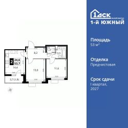 Продаётся 2-к квартира номер 616 общей площадью 53.7 кв.м. на 14-м этаже 24 этажного здания. Отделка Whitebox.