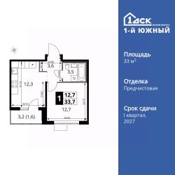 Продаётся 1-к квартира номер 803 общей площадью 33.7 кв.м. на 24-м этаже 24 этажного здания. Отделка Whitebox.