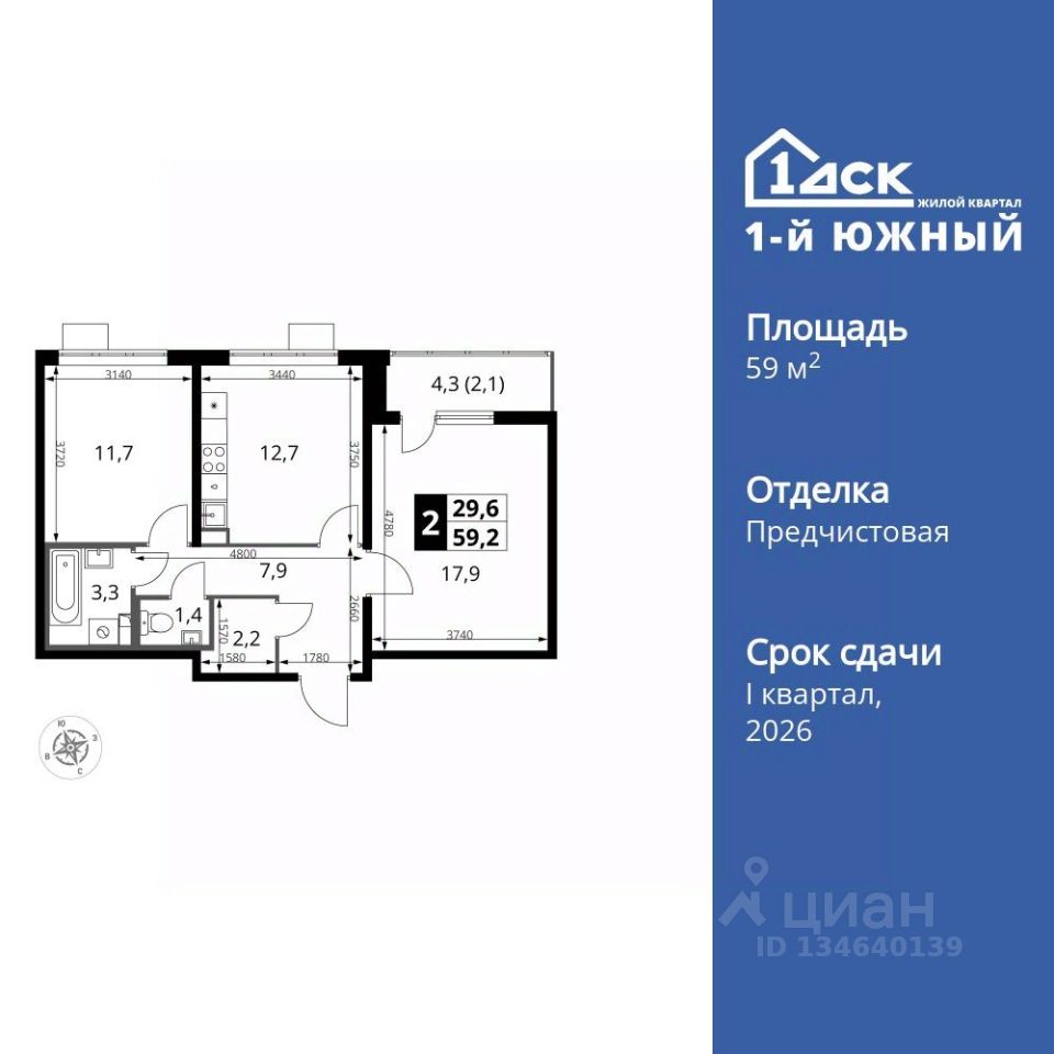 Продаётся 2-к квартира номер 178 общей площадью 59.1 кв.м. на 22-м этаже 25 этажного здания. Отделка Whitebox. Цена с учётом скидки.