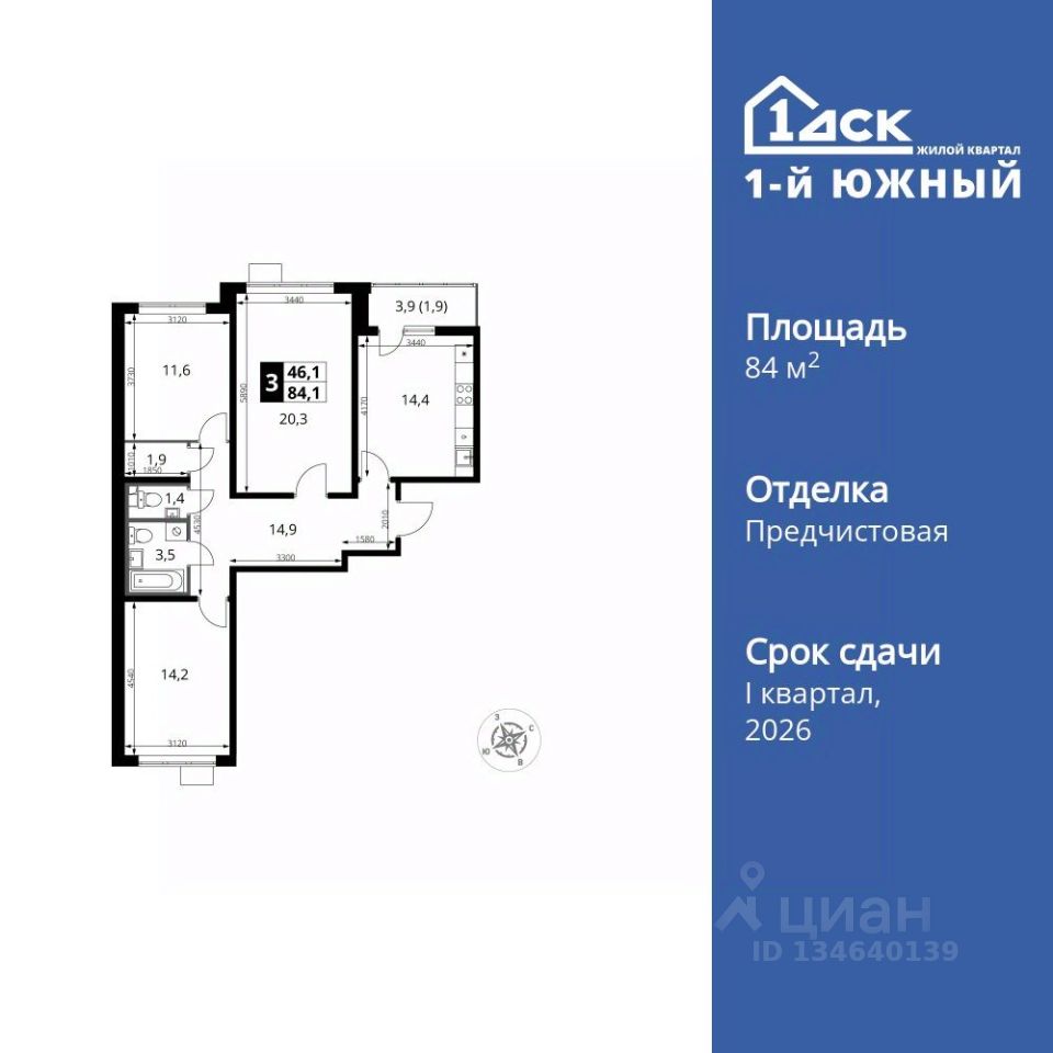 Продаётся 3-к квартира номер 275 общей площадью 84.1 кв.м. на 15-м этаже 25 этажного здания. Отделка Whitebox. Цена с учётом скидки.