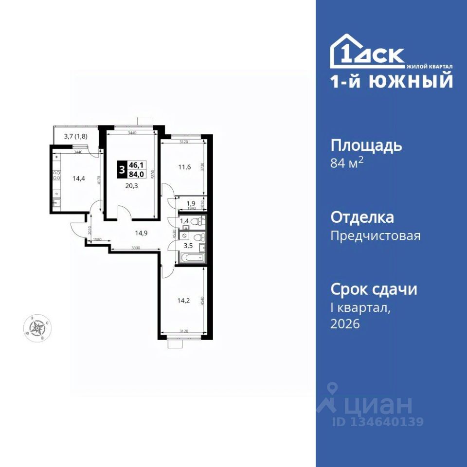 Продаётся 3-к квартира номер 401 общей площадью 84 кв.м. на 11-м этаже 24 этажного здания. Отделка Whitebox. Цена с учётом скидки.