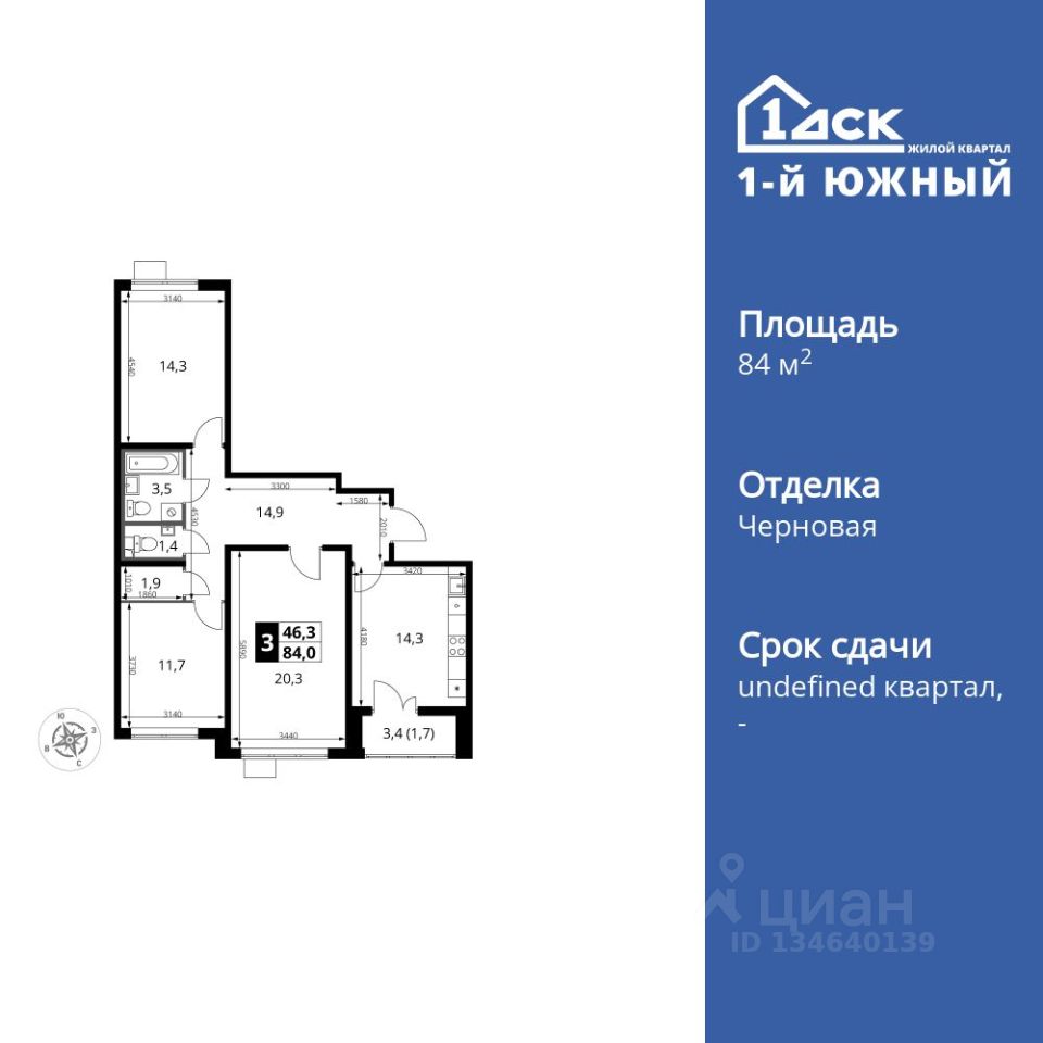 Продаётся 3-к квартира номер 45 общей площадью 84 кв.м. на 13-м этаже 25 этажного дома. Отделка Whitebox. Цена с учётом скидки!
