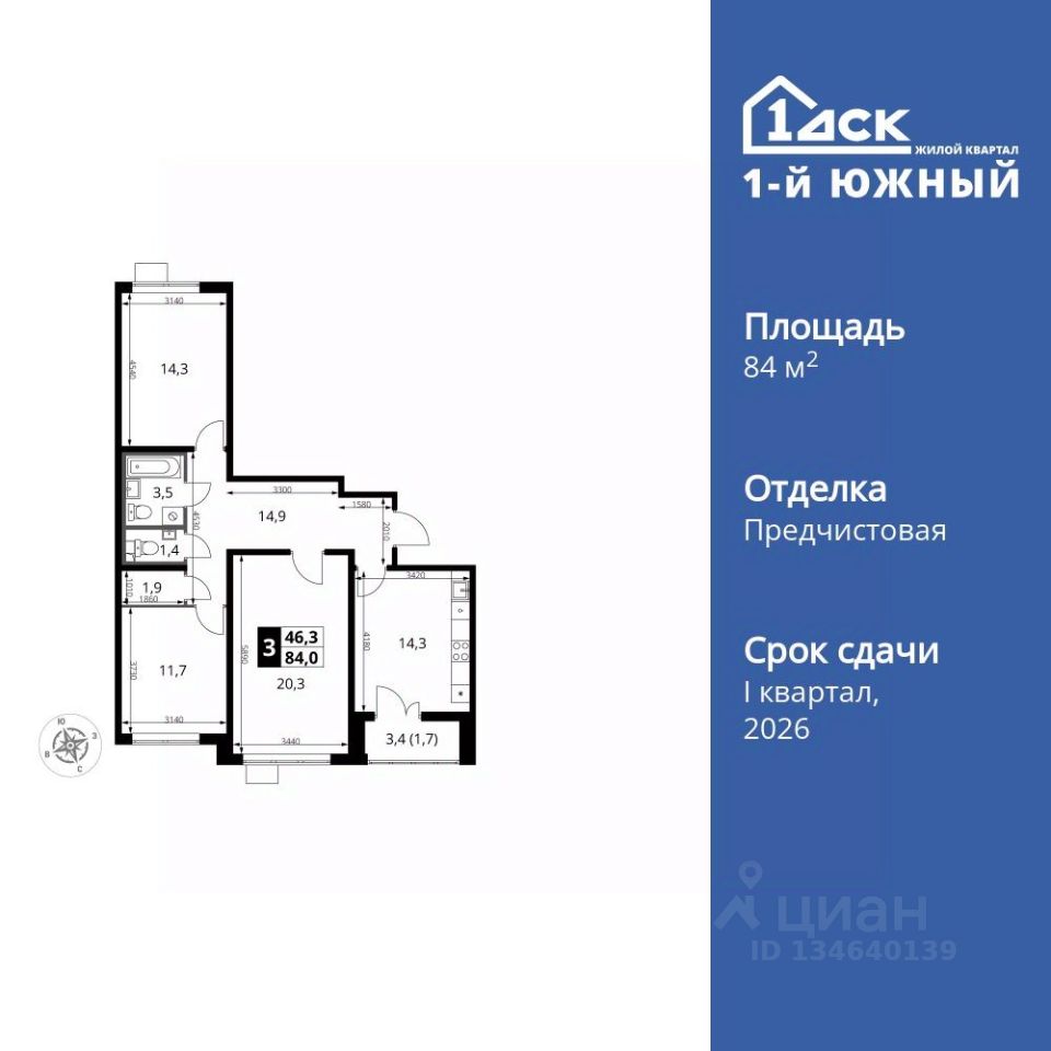 Продаётся 3-к квартира номер 81 общей площадью 84.1 кв.м. на 22-м этаже 25 этажного здания. Отделка Whitebox. Цена с учётом скидки.