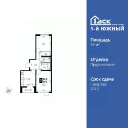 Продаётся 2-к квартира номер 172 общей площадью 59.4 кв.м. на 20-м этаже 25 этажного здания. Отделка Whitebox. Цена с учётом скидки.