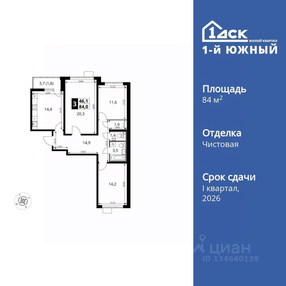 Продаётся 3-к квартира номер 436 общей площадью 84.1 кв.м. на 16-м этаже 24 этажного здания. Чистовая отделка. Цена с учётом скидки.