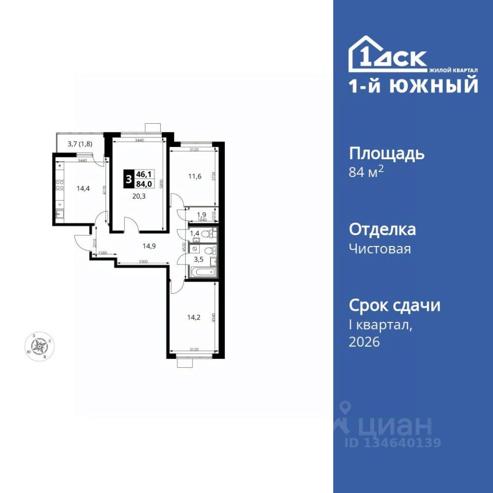 Продаётся 3-к квартира номер 443 общей площадью 84.1 кв.м. на 17-м этаже 24 этажного здания. Чистовая отделка. Цена с учётом скидки.