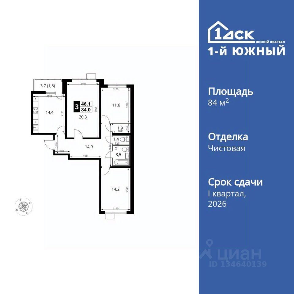Продаётся 3-к квартира номер 464 общей площадью 84.1 кв.м. на 20-м этаже 24 этажного здания. Чистовая отделка. Цена с учётом скидки.