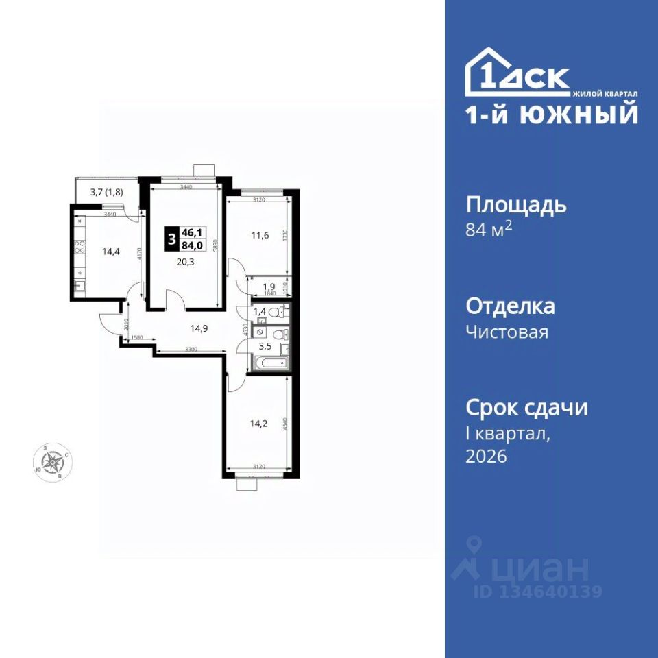 Продаётся 3-к квартира номер 478 общей площадью 84.1 кв.м. на 22-м этаже 24 этажного здания. Чистовая отделка. Цена с учётом скидки.