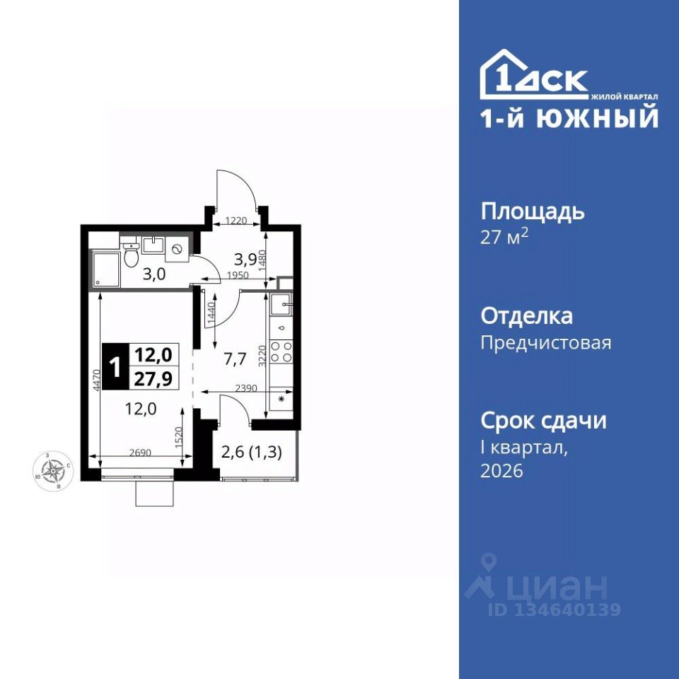 Продаётся квартира-студия номер 291 общей площадью 27.9 кв.м. на 14-м этаже 25 этажного здания. Отделка Whitebox.