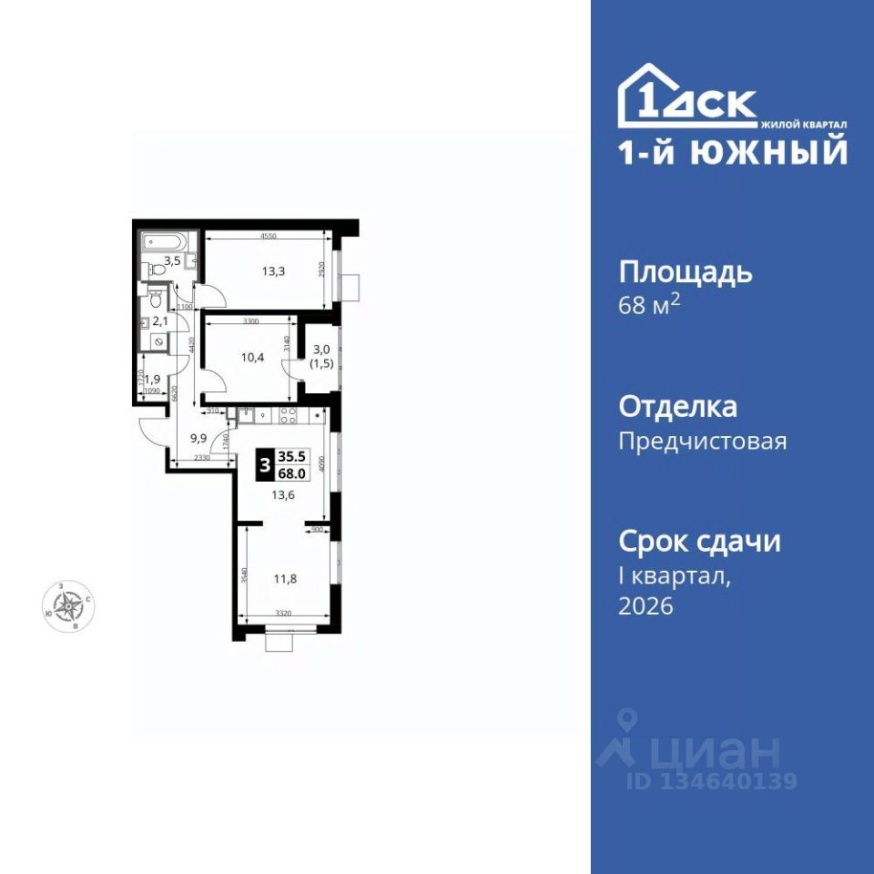 Продаётся 3-к квартира номер 337 общей площадью 68 кв.м. на 20-м этаже 25 этажного здания. Отделка Whitebox. Цена с учётом скидки.